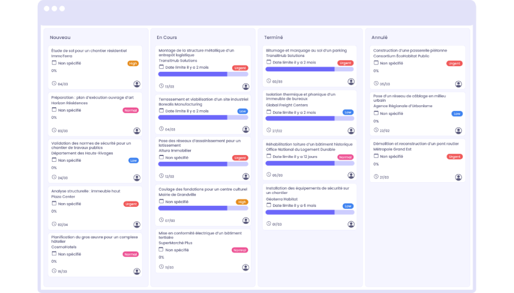 La planification et le suivi de projet optimisent l'efficacité en alignant les objectifs avec les actions, permettant une gestion précise des ressources et des délais. Nos outils de planification vous aident à identifier et résoudre rapidement les problèmes, garantissant des livraisons conformes et dans les temps, ce qui améliore directement la satisfaction client et la performance globale de vos services.