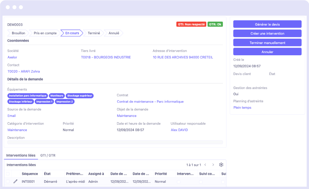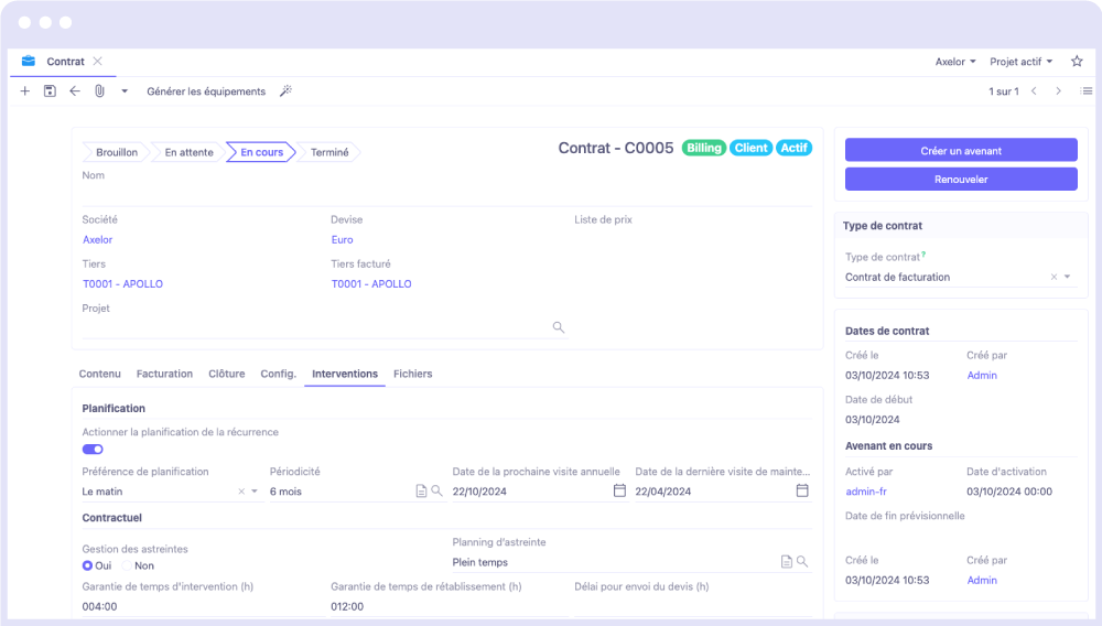 Notre module gestion des interventions est étroitement lié à notre module contrat afin de centraliser les informations. Gérez vos contrats, et planifiez automatiquement vos prochaines interventions récurrentes en fonction des équipements sous contrat.