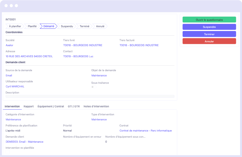 Aucun risque de négliger la gestion de vos interventions avec Axelor : Visualisez en un clin d’œil l’état de vos interventions et leur planification. Suivez toutes les étapes de l’intervention, avec des rapports accessibles et le détail des équipements concernés.