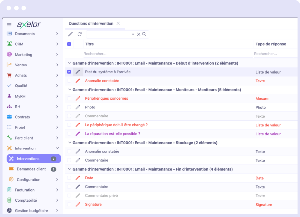 Le module Gestion des interventions d’Axelor est un système flexible qui vous permet de gérer efficacement divers types d’interventions pour un parc client, et d’assurer une qualité sans faille.
